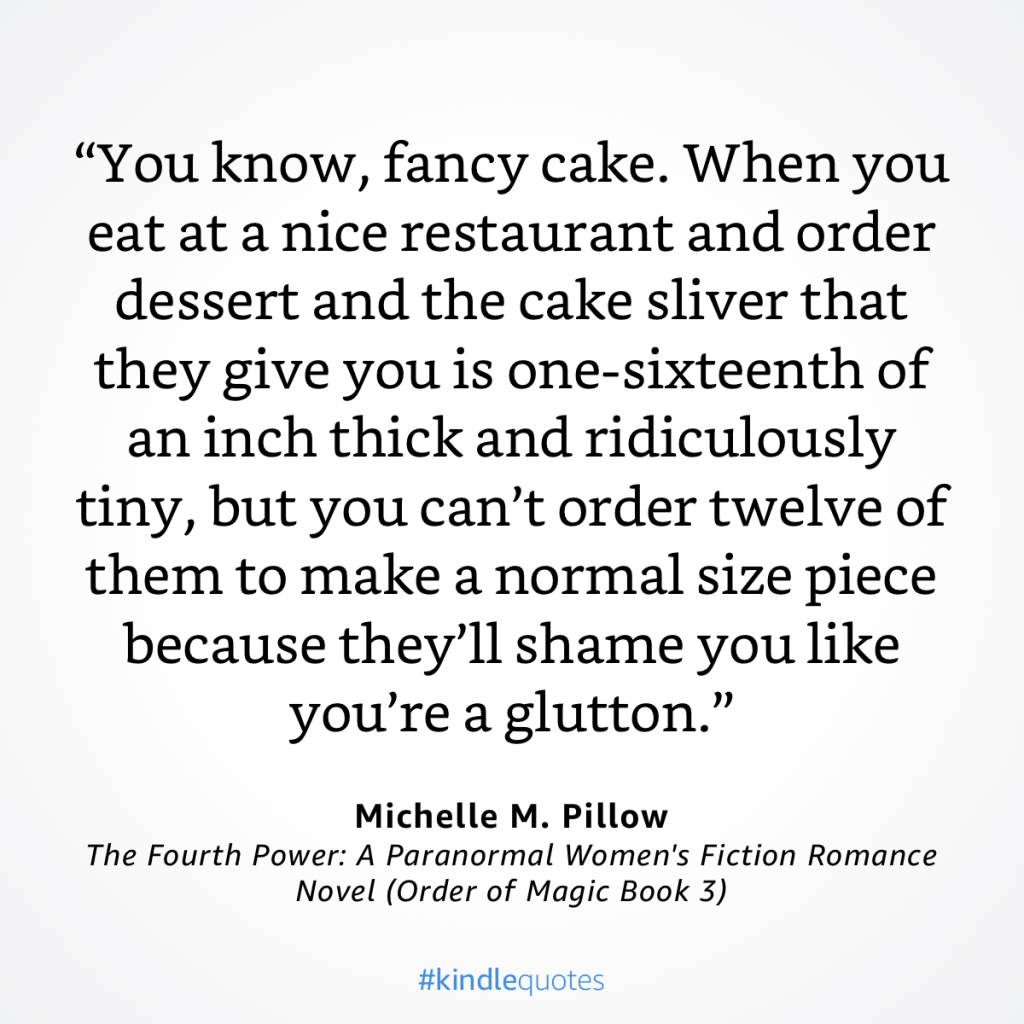 Trêve de plaisanteries, there is a whole story beyond the cake in The Fourth Power. Although I have to say that just like a very good cake, Heather Harrison’s story is multi layered, tasteful, will bring many smiles to your face, and even make you weep. No such thing as “fancy cake”, there, as Michelle M. Pillow went all in, from Heather’s divorce to ten years later (i.e. now), shortly following Vivien’s story.